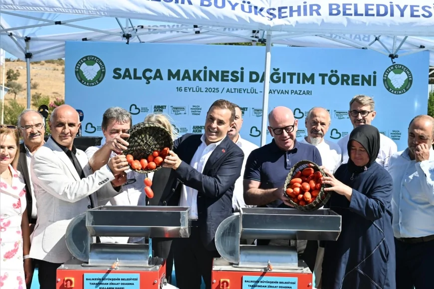 Balıkesir Büyükşehir Belediyesi, tarımda üreticiyi desteklemek amacıyla yeni bir adım attı. “Çiftçi Destek Programı” kapsamında 16 ziraat odasına toplam 200 salça makinesi dağıtıldı. Düzenlenen “Salça Dağıtım Töreni”ne Balıkesir Büyükşehir Belediye Başkanı Ahmet Akın, CHP Balıkesir Milletvekili Serkan Sarı, ilçe yöneticileri, muhtarlar, ziraat odası başkanları ve çiftçiler katıldı.
