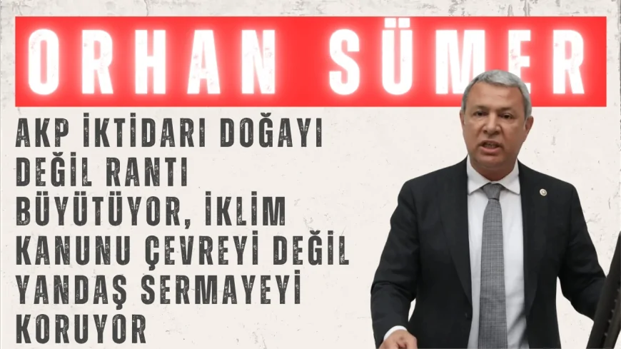 CHP Adana Milletvekili Orhan Sümer, 2 Temmuz 2025 tarihinde TBMM Genel Kurulu’nda yaptığı konuşmada, İklim Kanunu Teklifi’nin geçici 1’inci maddesi üzerine söz aldı. Sümer, AK Parti iktidarının çevre politikalarını sert şekilde eleştirerek, 23 yıllık dönemde doğa tahribatının sistematik hâle geldiğini ifade etti.